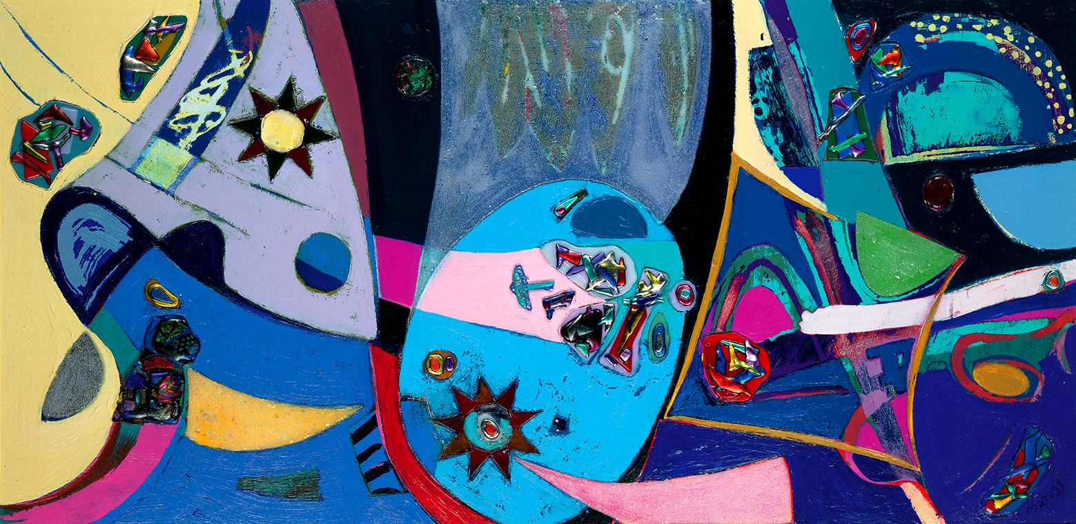 Title : ‘Exotic Party’ Acrylic & resin on wood. 175cm x 84cm Tray Frame £3500